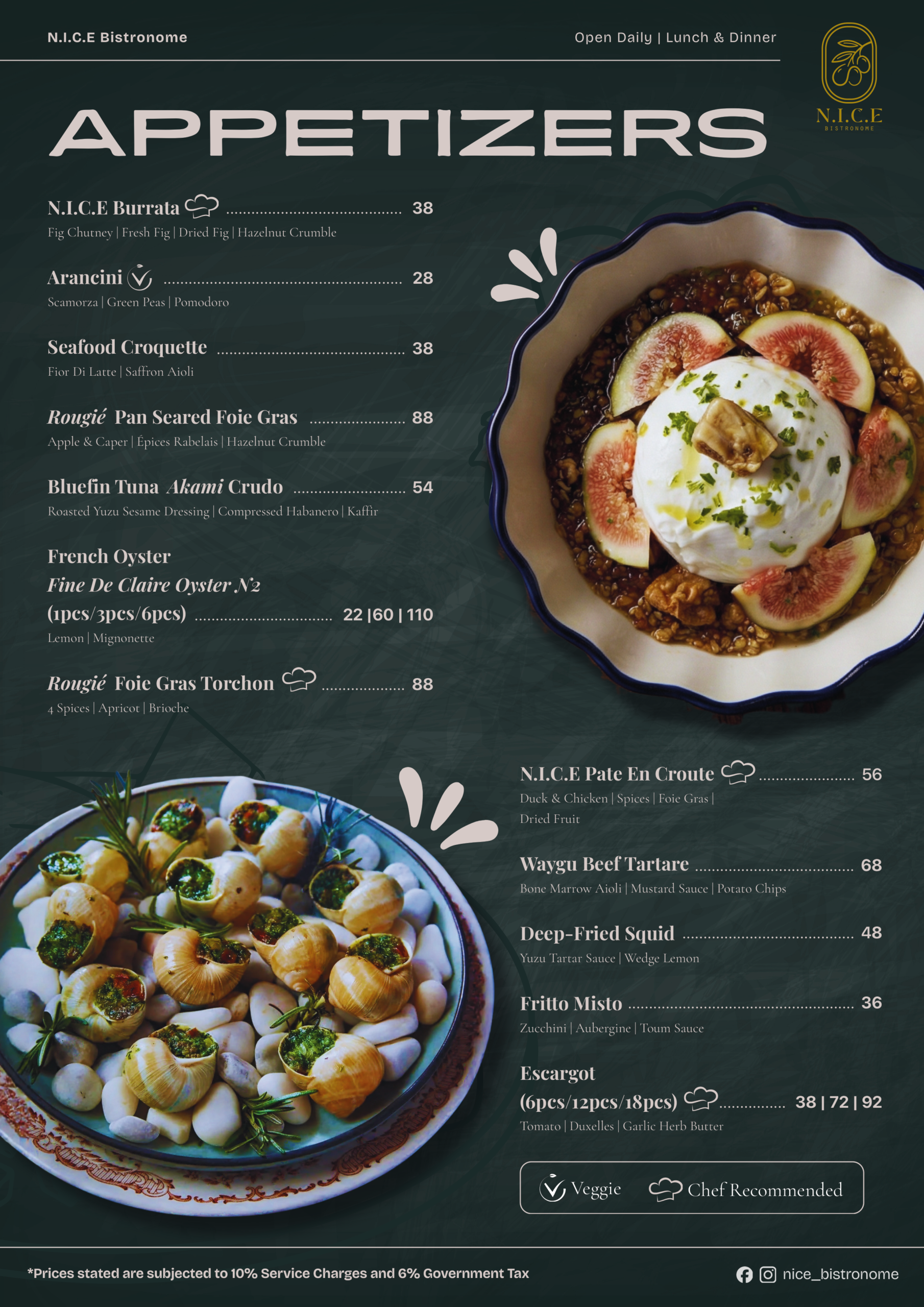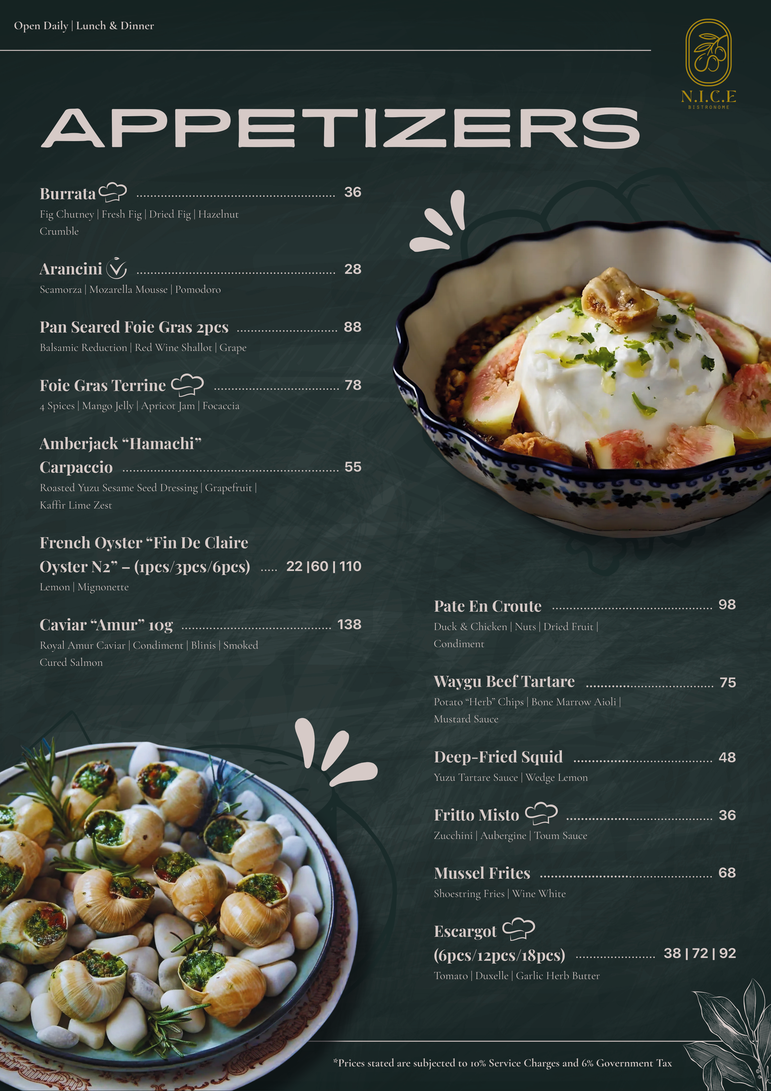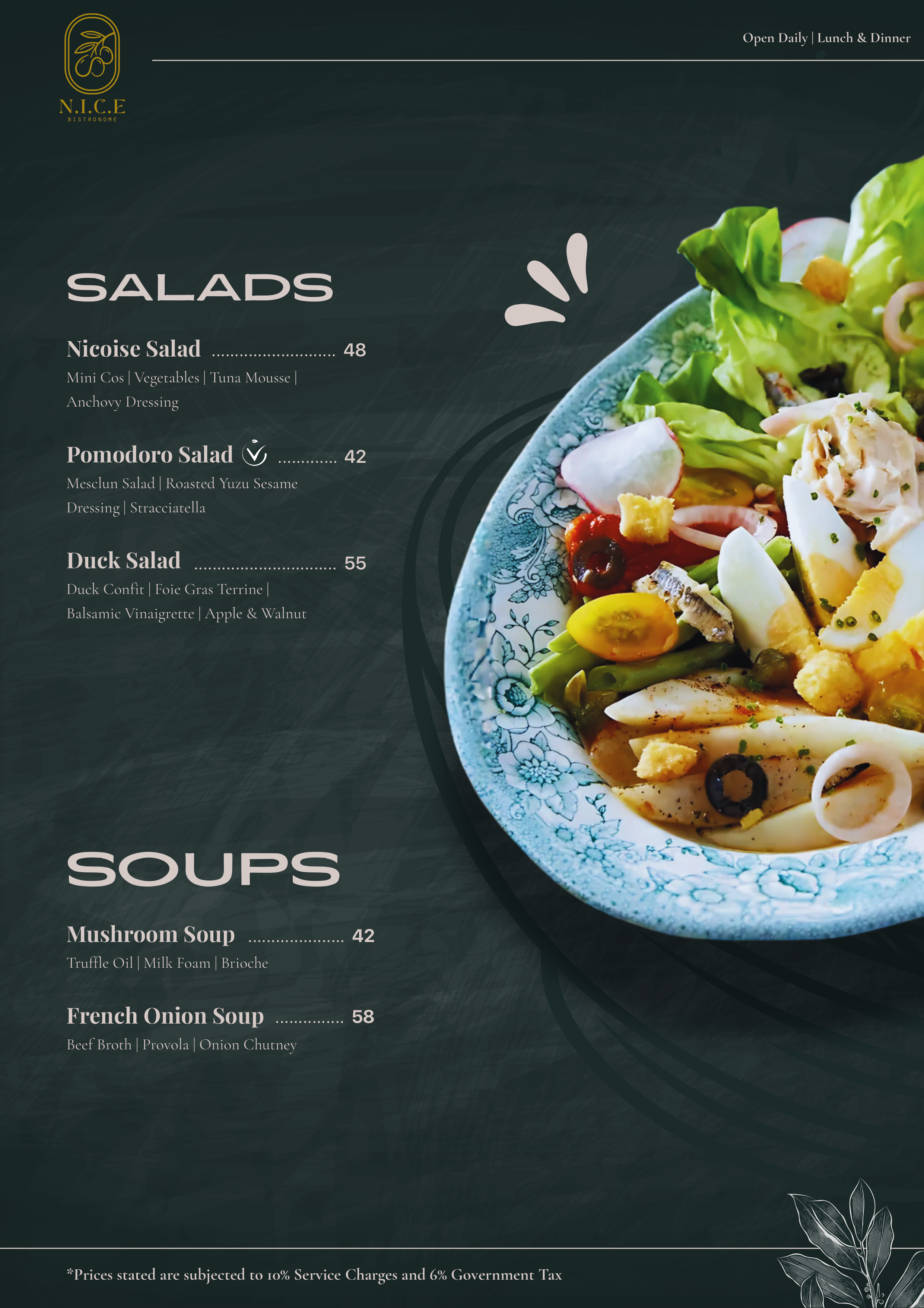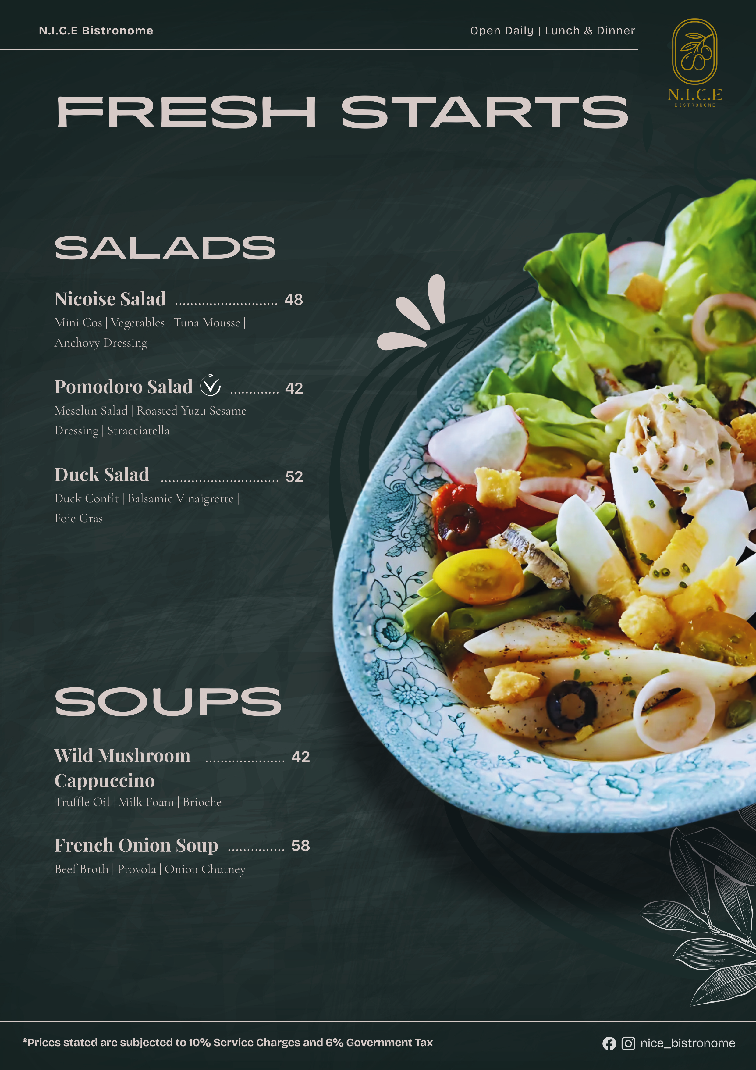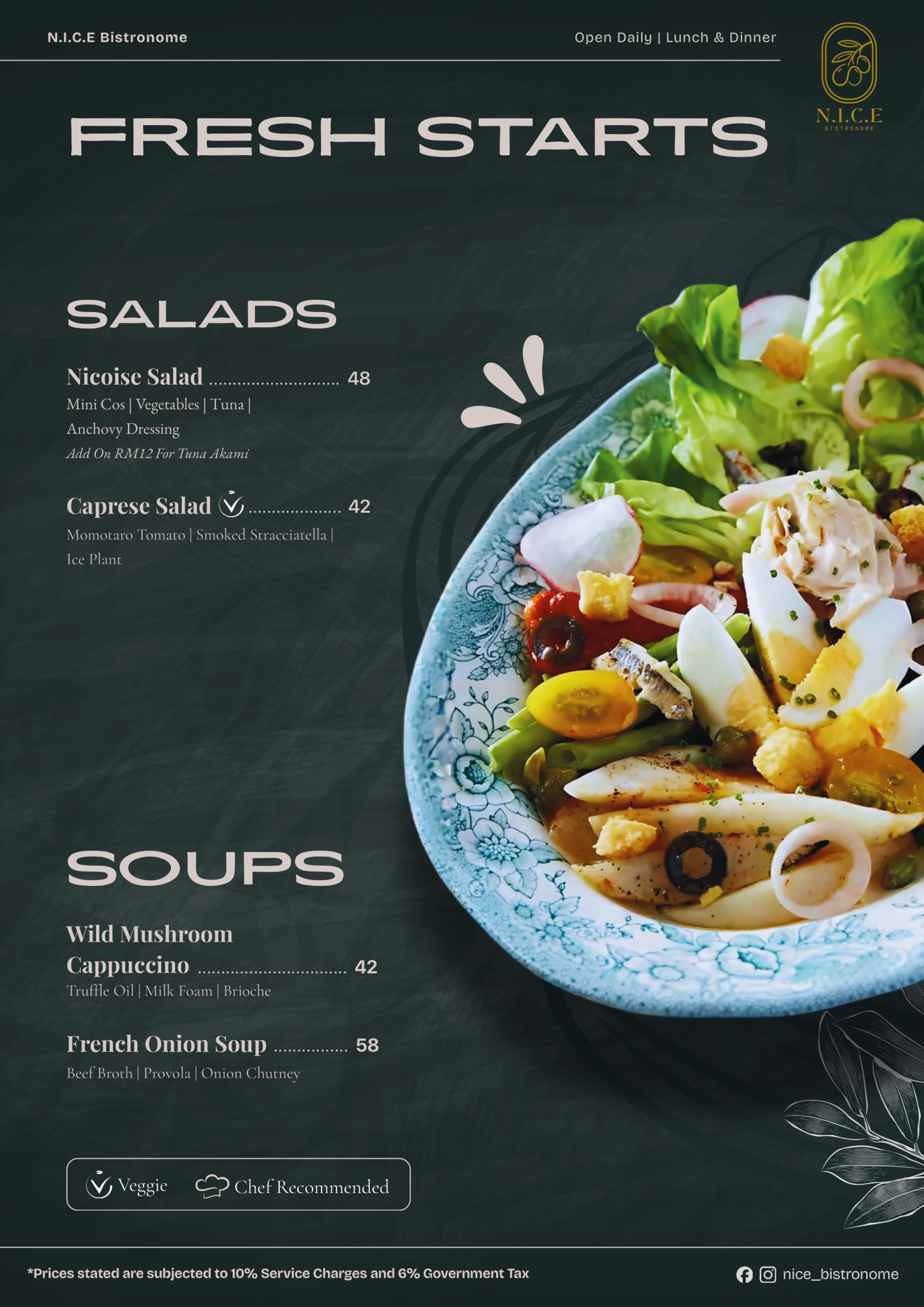 NIÇOISE SALAD | Seasonal vegetables of potatoes, tomatoes, lettuce, bell peppers, cucumbers, beans and radish served with tuna, capers, eggs, olives, and an anchovy dressing – A dish inspired by the terroirs of Nice, sourcing for the freshest seasonal ingredients within its locality