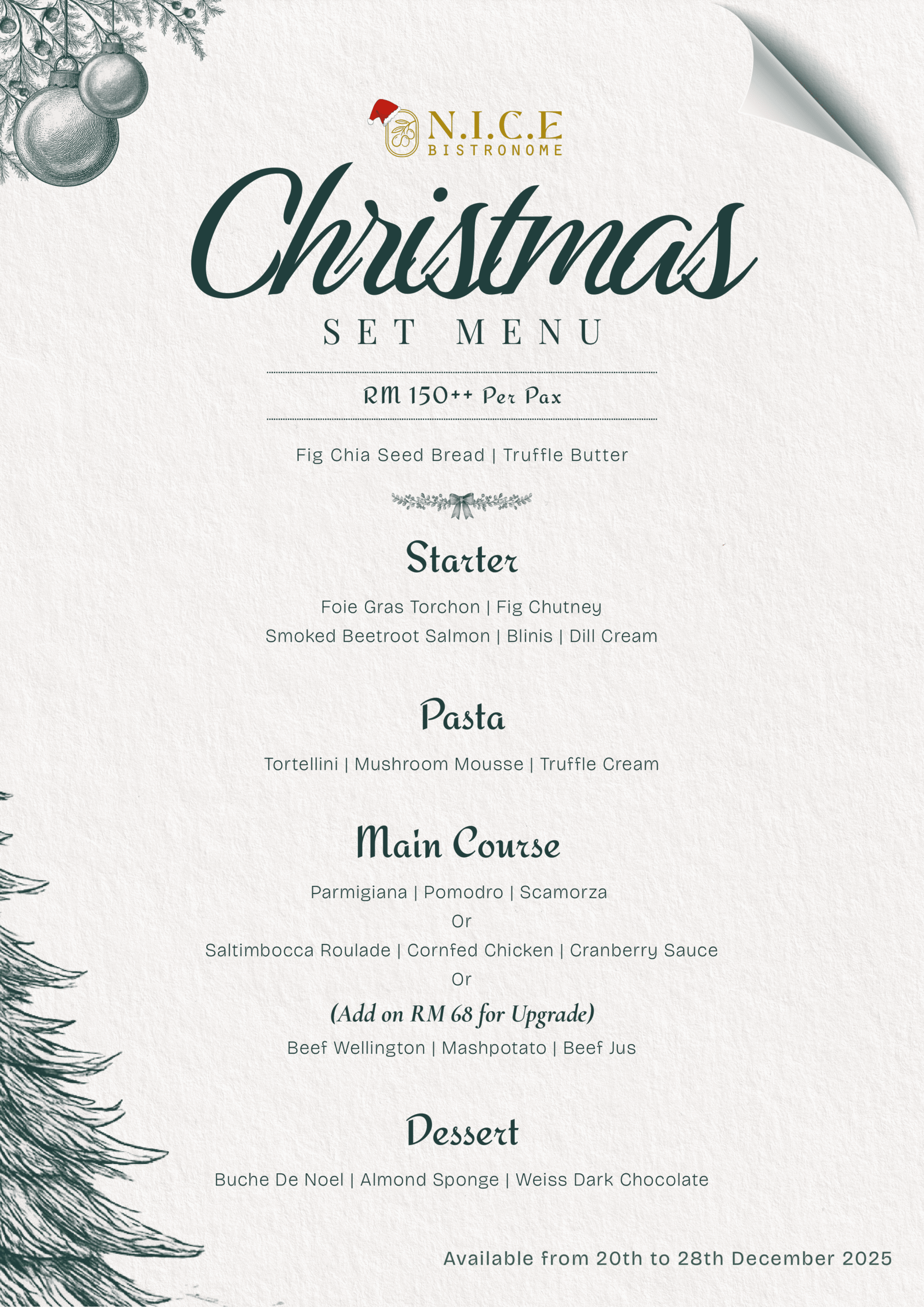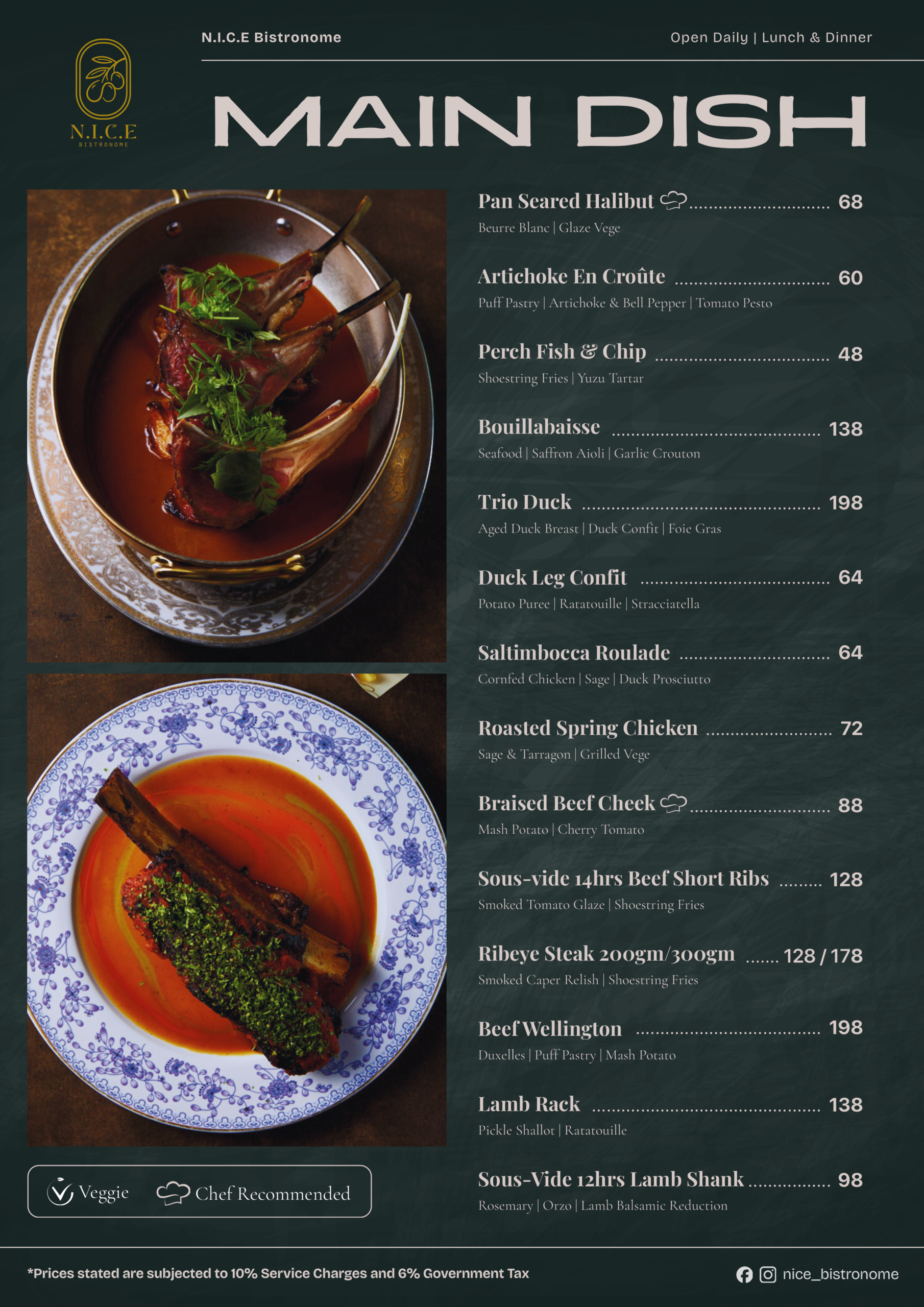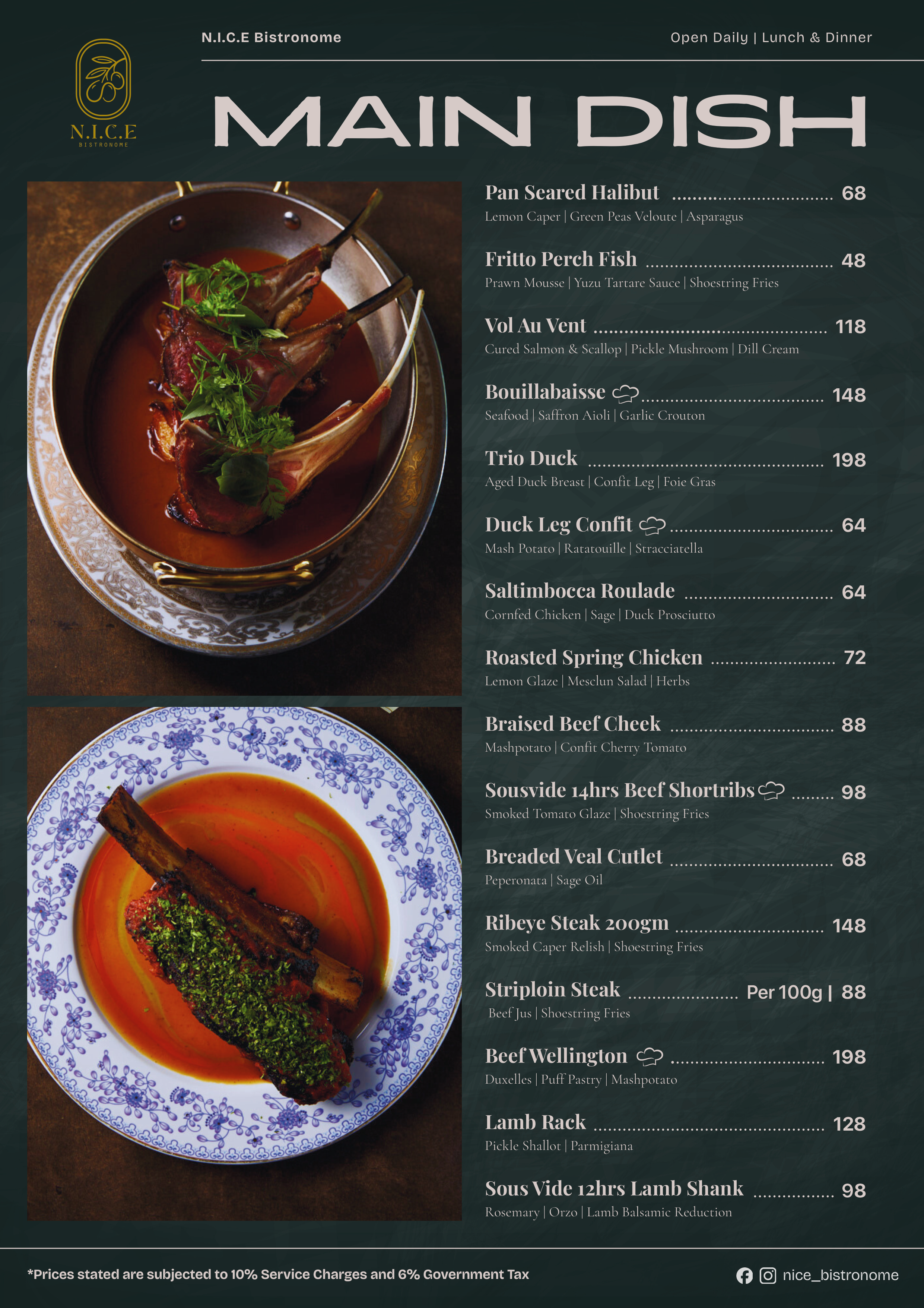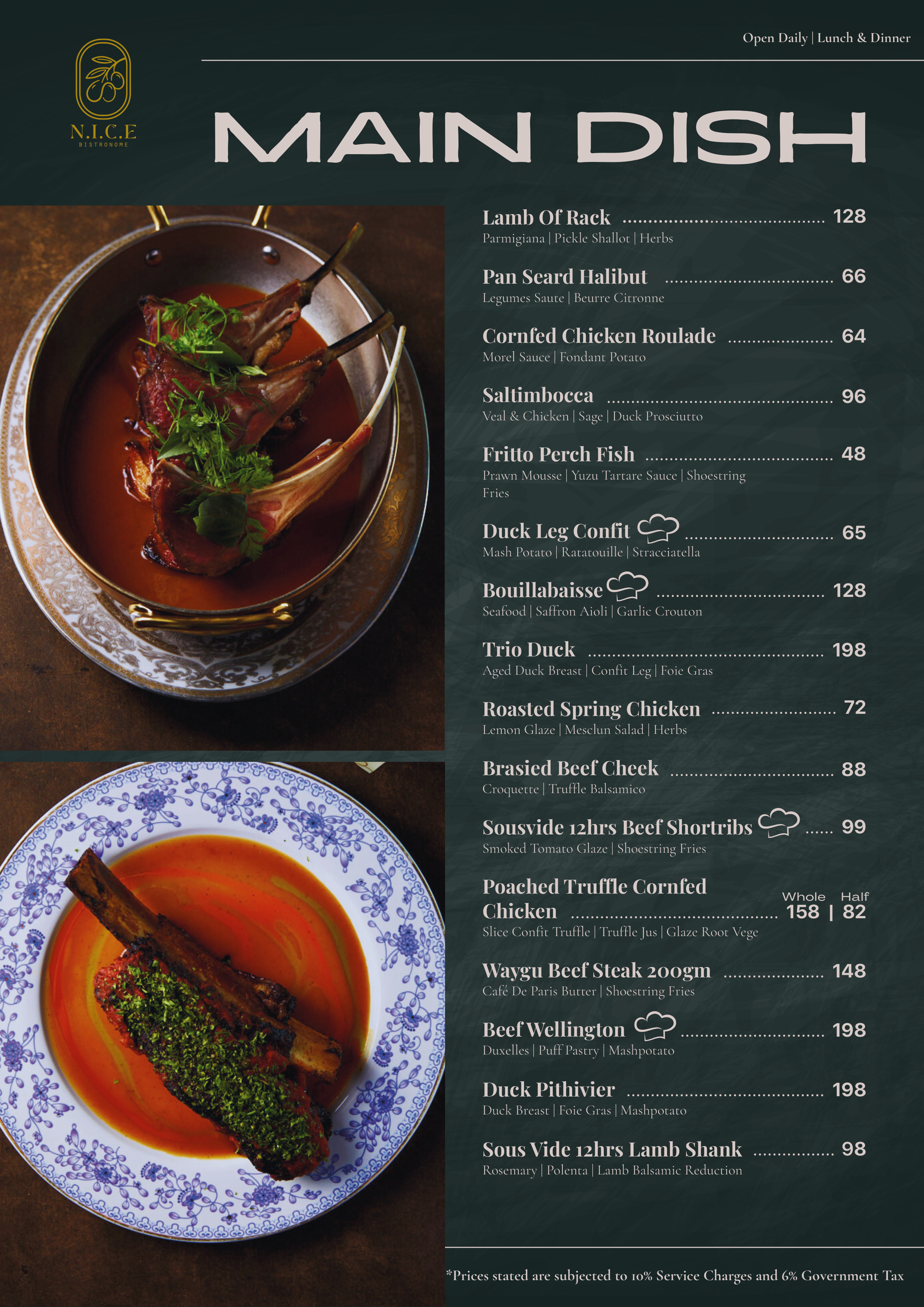 SALTIMBOCCA | A classic Italian veal dish, N.I.C.E.’s version comprises a corn fed chicken roulade sous vide at 64°C and then pan seared, served with cured duck prosciutto, smoked cheese and sage on a bed of mashed potatoes